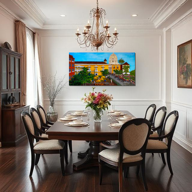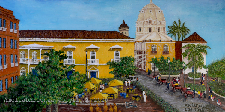 Architecture: The focal point is the bright yellow colonial building and the surrounding plaza. The large white dome in the background is a signature silhouette of the Cartagena skyline.