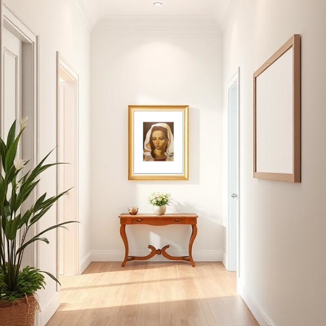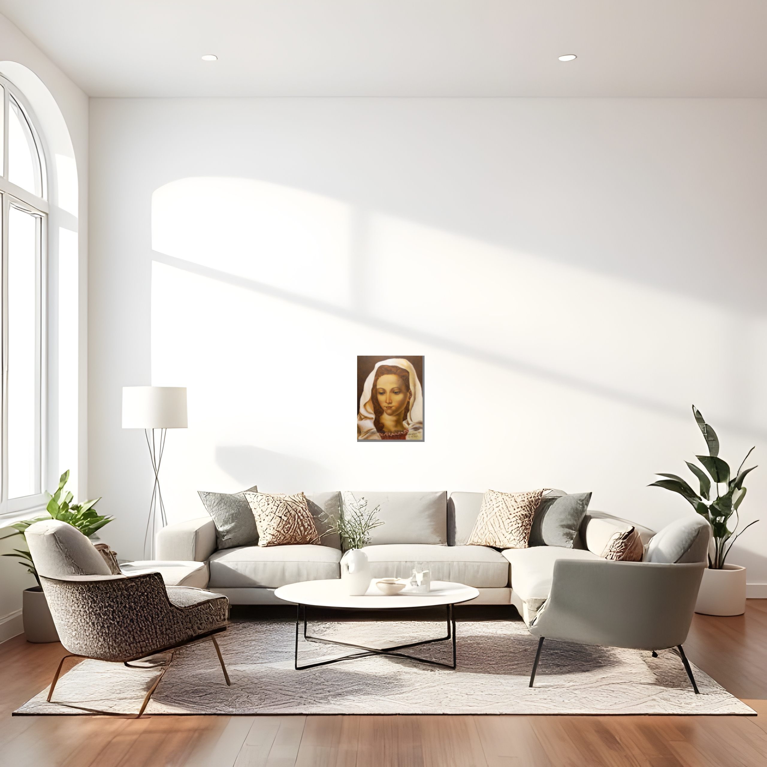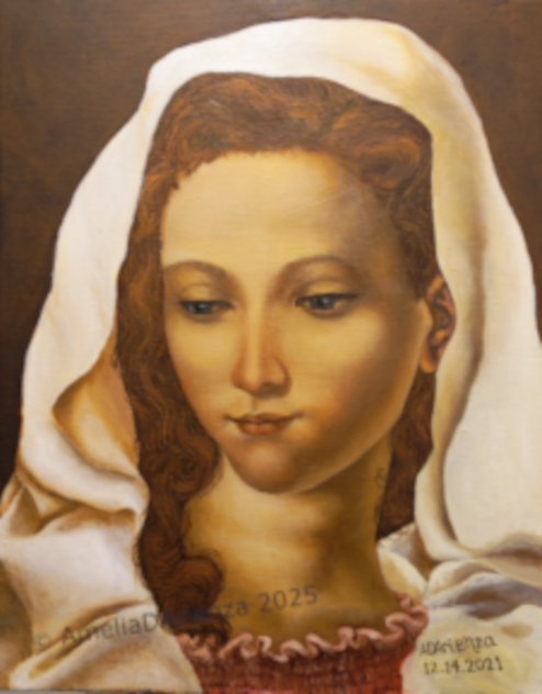 Rendered in traditional oil painting, this image offers a tender portrayal of the Blessed Virgin Mary. It is part of Amelia’s Sacred Reflections series. The artwork invites quiet contemplation and devotion, capturing the Mother of God with a serene expression and gentle smile—an image meant to inspire prayer and trust in her intercession.